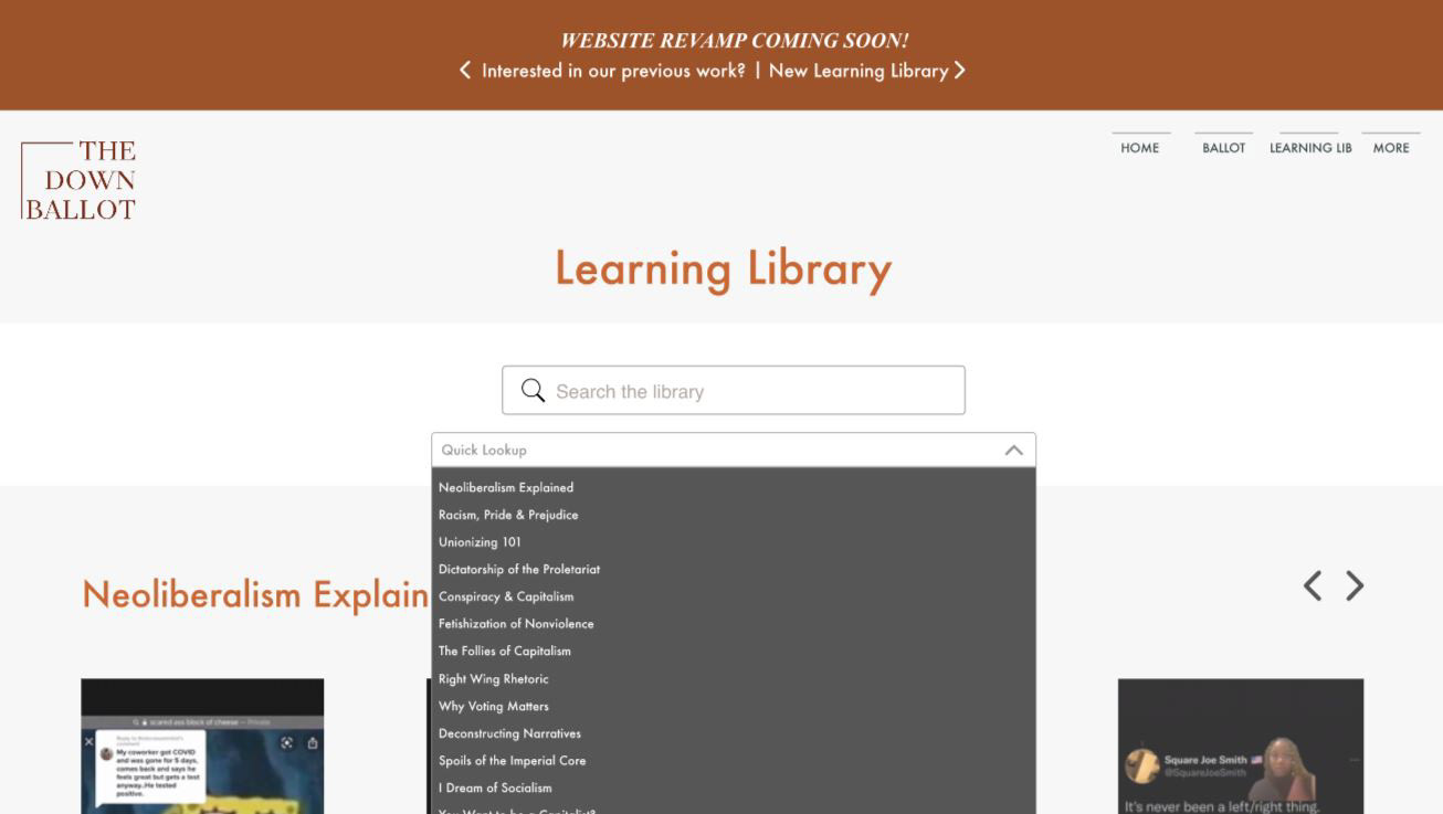 The Learning Library is a new feature that showcases educational videos for thedownballot, a civic tech organization that aims to keep constituents connected from local elections. I was assigned to produce some high-fidelity wireframes given lower-fidelity ones for the web. With the limitation of providing videos from thedownballot's platform, I designed two main methods of navigation to access the library: